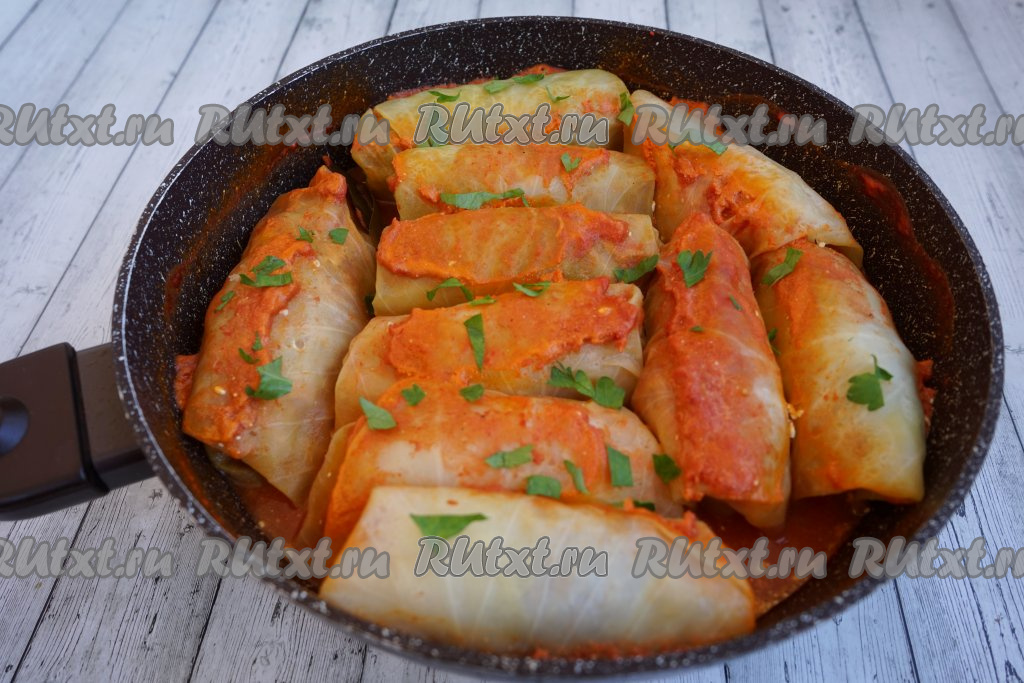 По прошествии получаса сочные и вкусные голубцы, тушёные в томатно-сметанном соусе готовы, снимаем сковороду с огня. По желанию, перед подачей блюдо можно украсить рубленной зеленью петрушки или укропа.