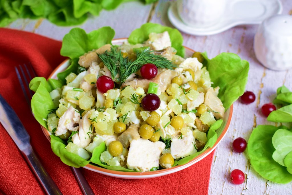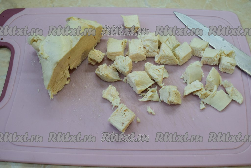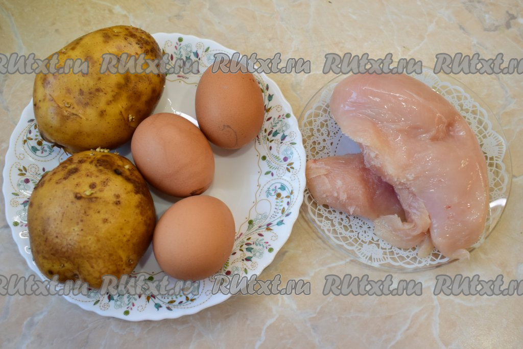 Для приготовления салата необходимо подготовить ингредиенты. Яйца отварите в кипящей воде на протяжении 7-8 минут, затем горячую воду слейте и охладите их, залив холодной водой. Картофель варите, не очищая от кожуры, в кипящей воде минут 20-30 (продолжительность варки зависит и от сорта, и от размера клубней, готовая картошка должна легко прокалываться вилкой), затем воду слейте и дайте картошинам остыть. Куриное филе варите в кипящей воде в течение 30 минут, затем дайте мясу остыть.