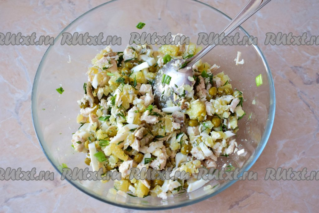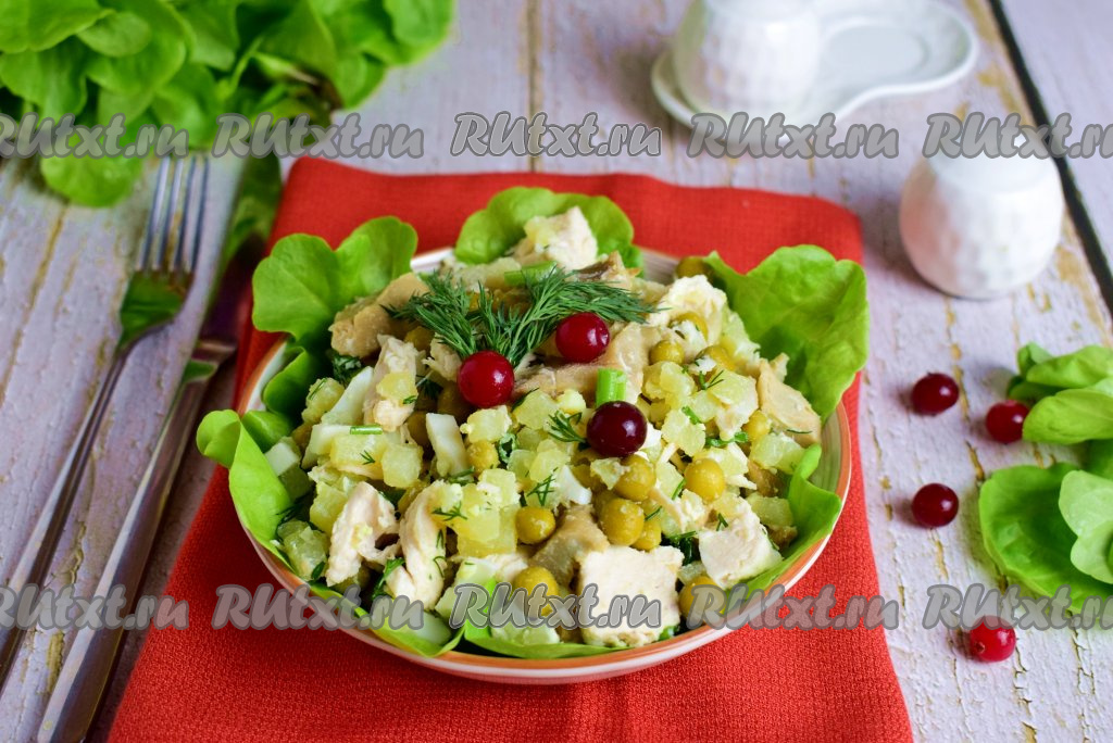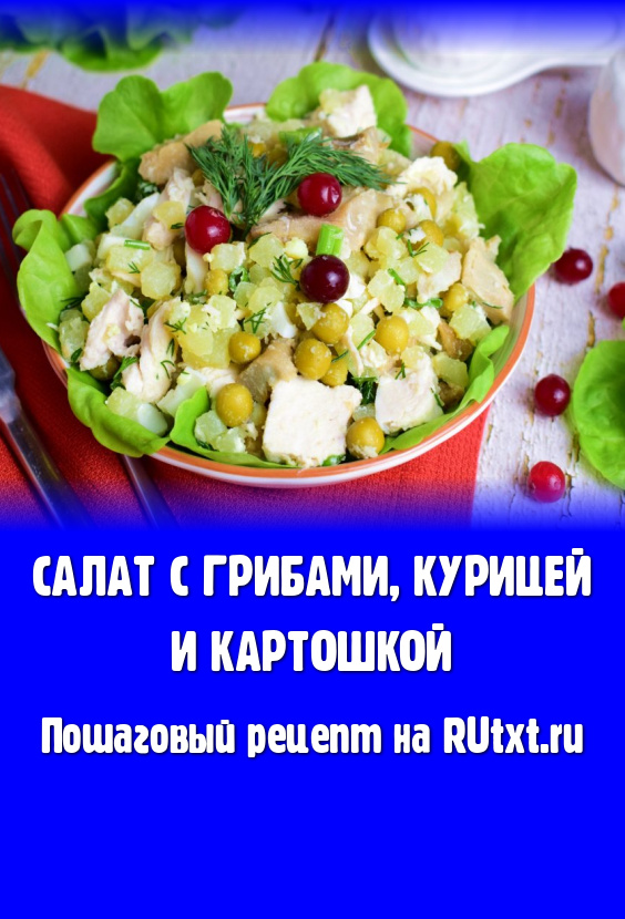 Предлагаю вам приготовить для повседневных будней салат с курицей, грибами и картошкой. Все ингредиенты очень сытные, они отлично дополняют друг друга, поэтому готовый салатик можно подать в качестве самостоятельного блюда. Я заправила салат оливковым маслом, его можно заменить на сметану или майонез. Уверена, вкус этого простого салата понравится всей семье!