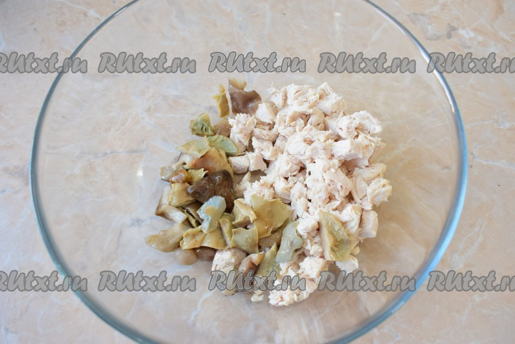 В чаше для приготовления салата соедините нарезанное куриное мясо и солёные (или маринованные) грибы. Можно использовать любые солёные (или маринованные) грибочки (у меня ассорти из лесных грибов).