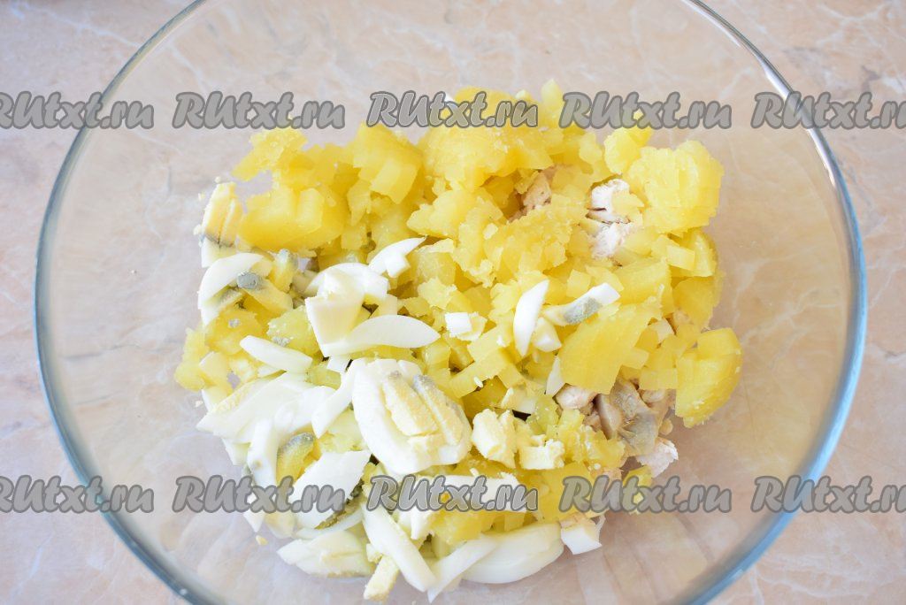 Очистите отварной картофель от кожуры, яйца - от скорлупы. Затем нарежьте картошку и яйца кубиками, выложите к грибочкам и куриному мясу.