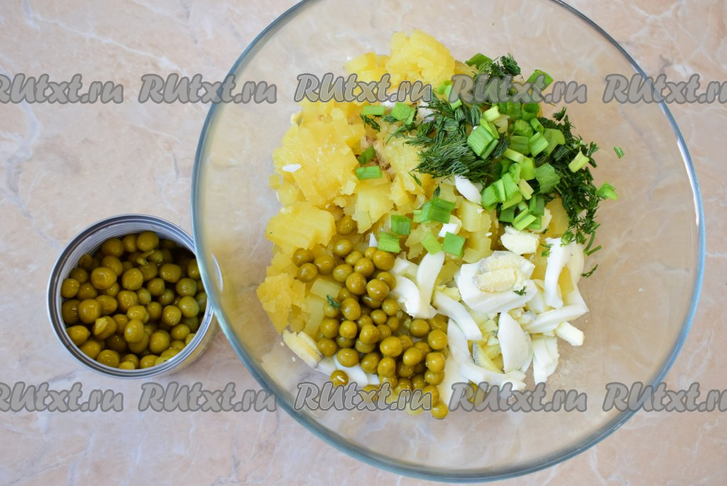 Следом добавьте в салат нарезанную свежую зелень. Можно взять любую зелень по своему вкусу. У меня немного укропа и зелёного лука. Откройте маленькую баночку консервированного горошка и слейте с неё жидкость. Добавьте горошек в салат.