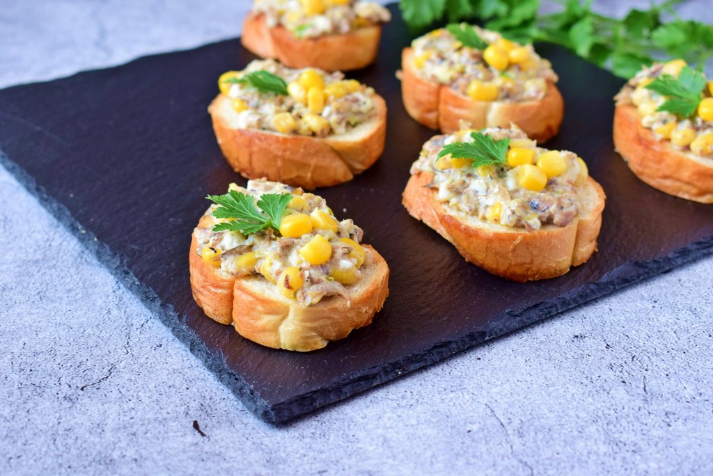 Вкусные и ароматные бутерброды со шпротной намазкой готовы, украсьте их зеленью, зёрнышками кукурузы и подавайте к столу.