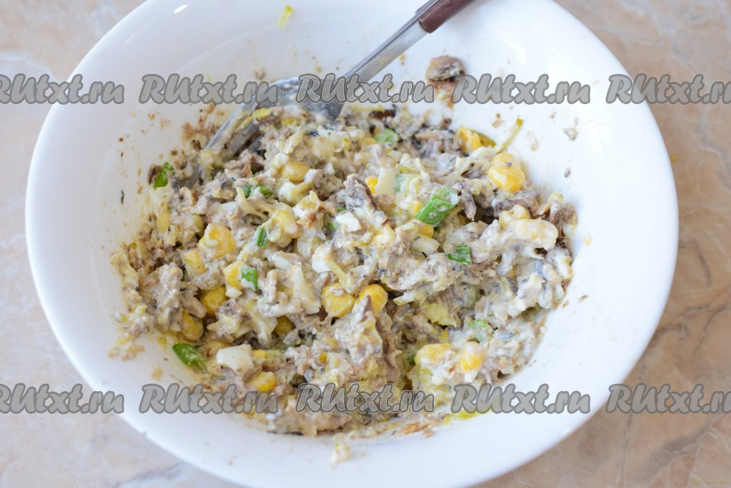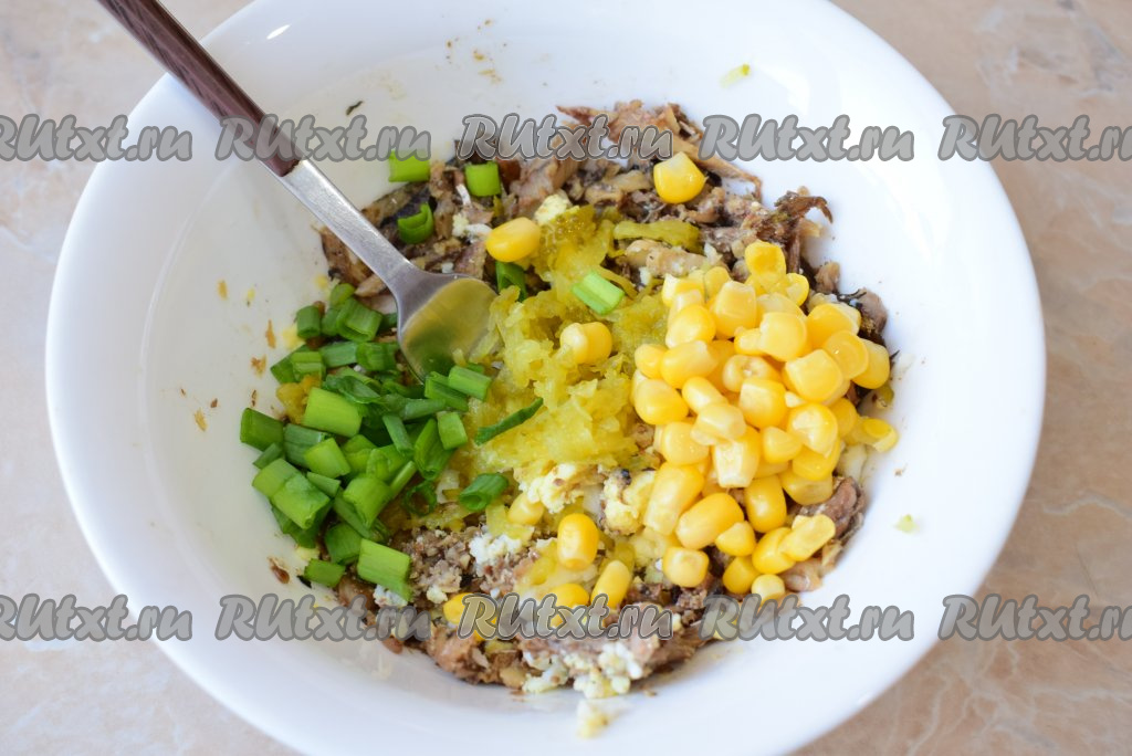 Затем сюда же выложите зёрна консервированной кукурузы. По желанию, положите несколько мелко нарезанных пёрышек зелёного лука.