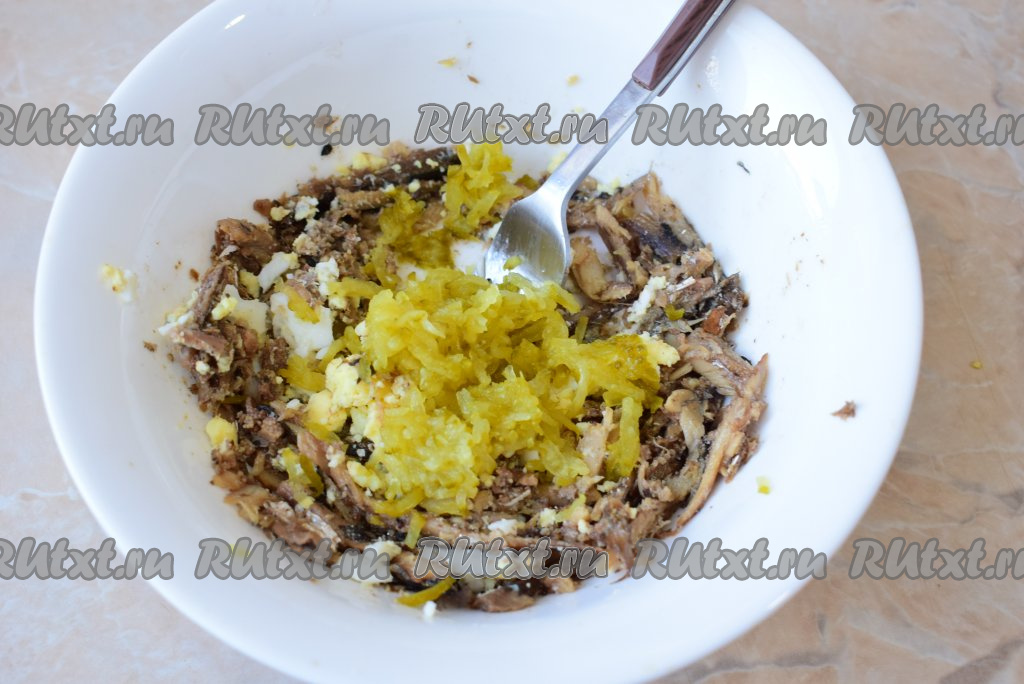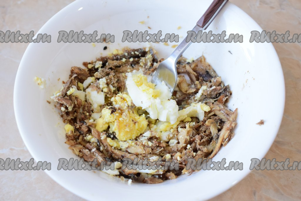 Следом добавьте в миску варёное яйцо, которое также хорошо разомните вилкой.