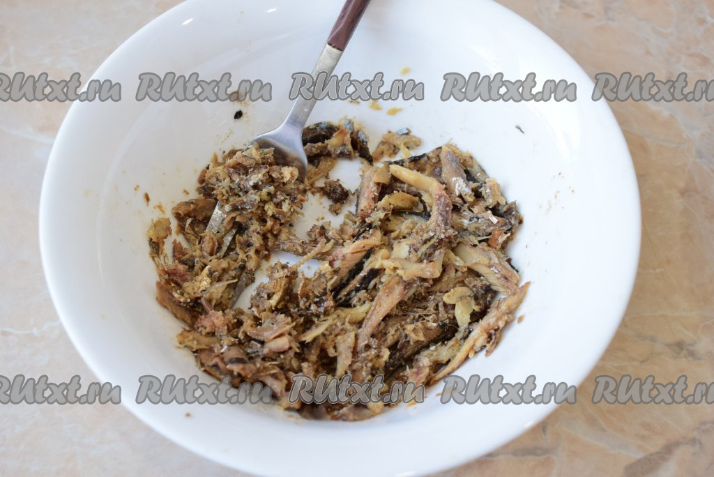 Яйцо предварительно нужно отварить вкрутую (варим 8-10 минут с момента закипания), остудить и очистить. Выложите шпроты в небольшую миску. Хорошо разомните их с помощью вилки.