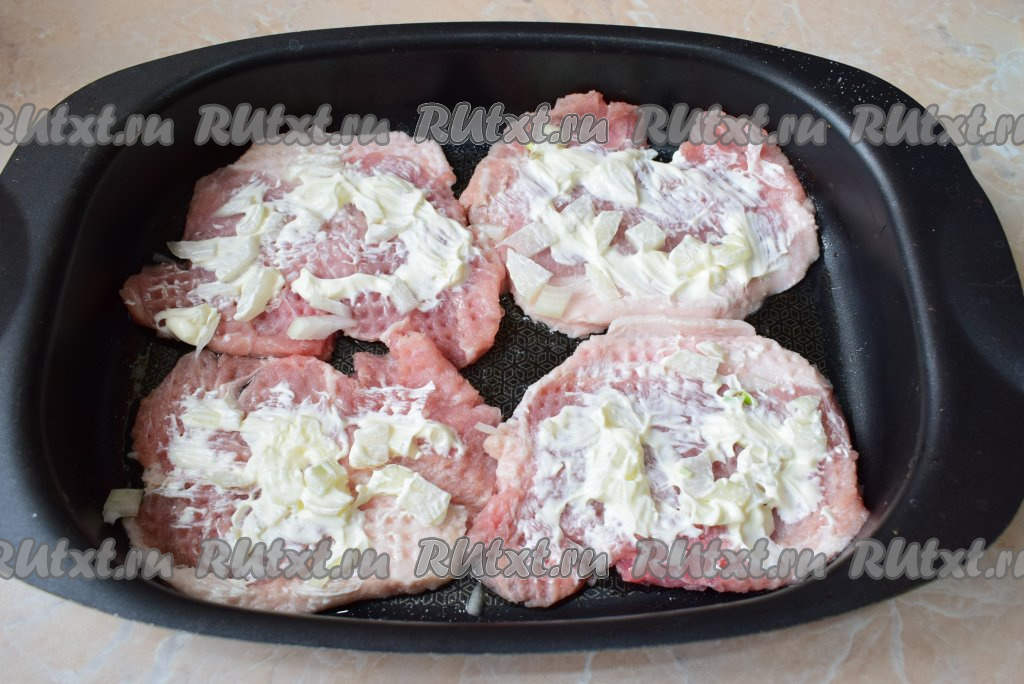 Лук очистите от шелухи, ополосните, затем мелко нарежьте. На каждый кусочек мяса выложите нарезанный лук. Немного смажьте майонезом кусочки свинины с луком.