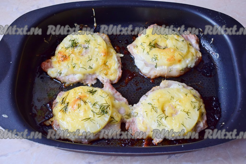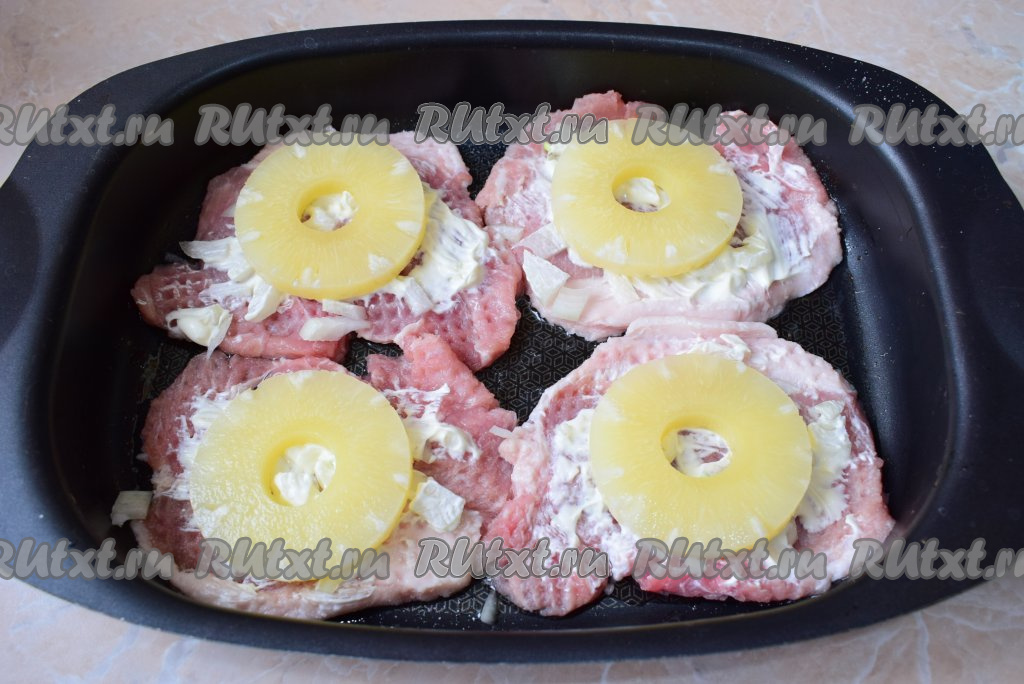 Затем выложите на каждую отбивную по кружочку ананаса.