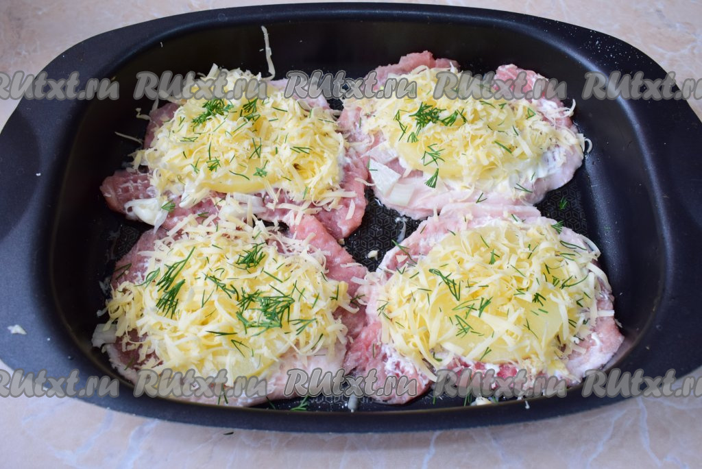 Посыпьте свиные отбивные натёртым сыром и небольшим количеством измельчённого укропа. Поставьте форму в духовку, предварительно разогретую до 180 градусов, на 25-30 минут (ориентируйтесь по своей духовке).