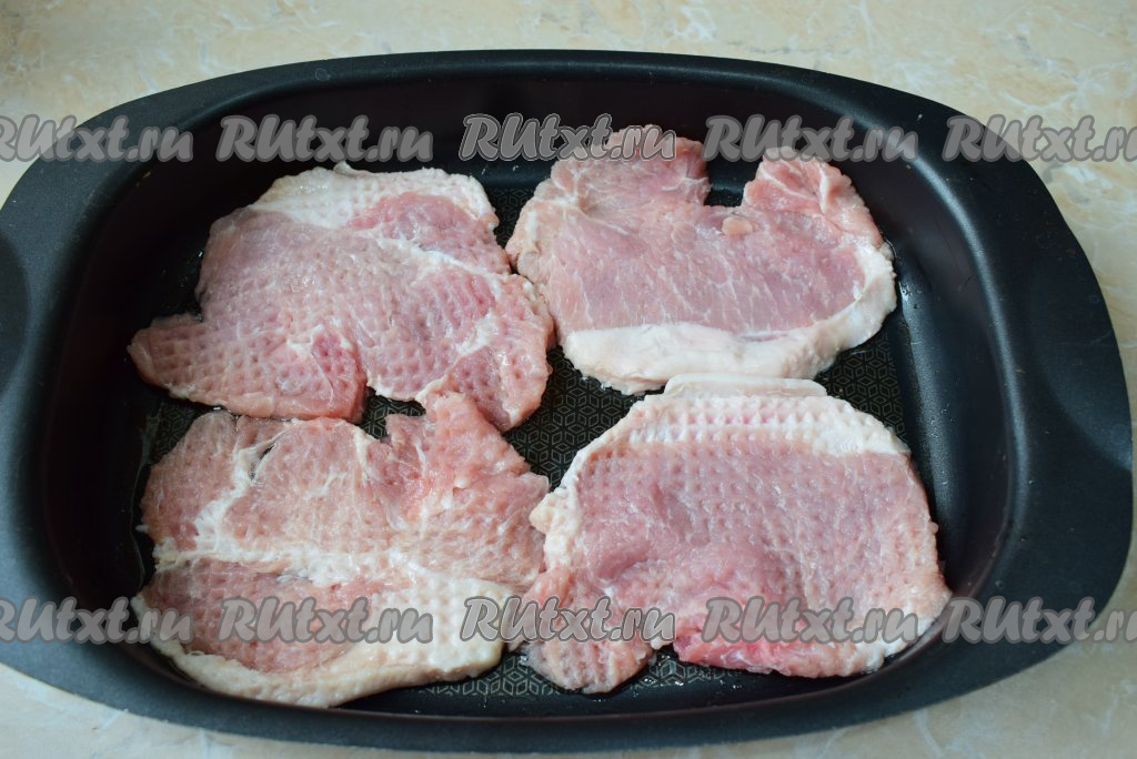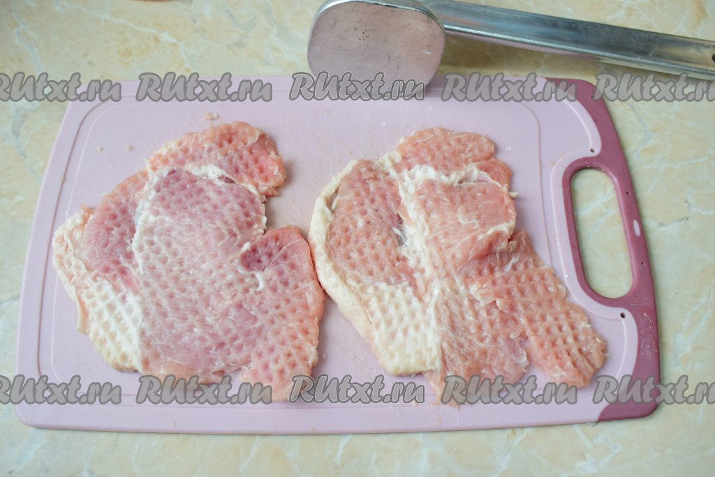 Свинину вымойте, обсушите, а после этого нарежьте на достаточно тонкие порционные кусочки и немного отбейте с помощью кухонного молоточка (не нужно отбивать мясо до прозрачности). Особое внимание обратите на толщину отбивных, кусочки не должны быть толстыми, так как запекать мы будем мясо в духовке непродолжительное время и свинина за это время должна полностью приготовиться.