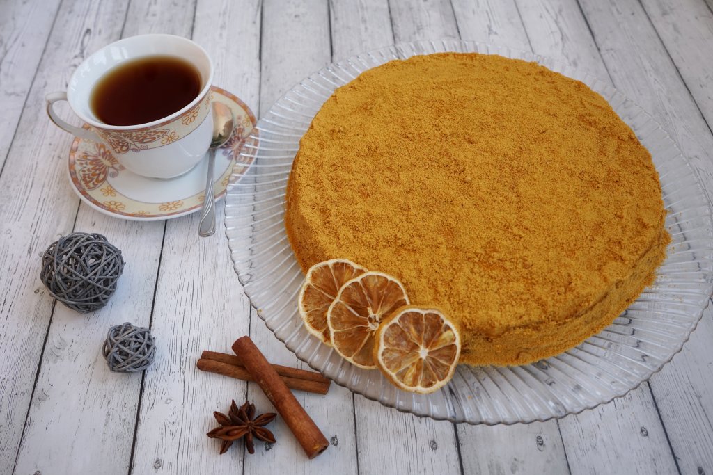 Украшаем наш торт крошкой по бокам и сверху. Теперь тортик нужно отправить в холодильник настояться (на это потребуется, как минимум, 5 часов, а ещё лучше оставить его пропитываться на ночь). После этого наш нежнейший домашний медовый торт со сметанным кремом готов. Нарезаем и подаём к столу. Уверена, этот наивкуснейший, тающий во рту медовик понравится и вам, и вашим близким!