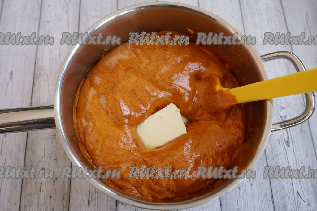 Снимаем кастрюлю с огня и добавляем 50 грамм сливочного масла. Тщательно перемешиваем, чтобы масло растаяло. Теперь сахарно-медовую массу нужно остудить до комнатной температуры.