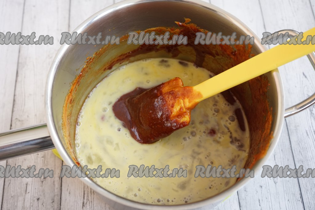 В остывшую сахарно-медовую массу добавляем яйца (будьте внимательны, если сахарно-медовая смесь слишком горячая, яйца просто свернутся, поэтому обязательно проконтролируйте температуру), тщательно перемешиваем тесто.
