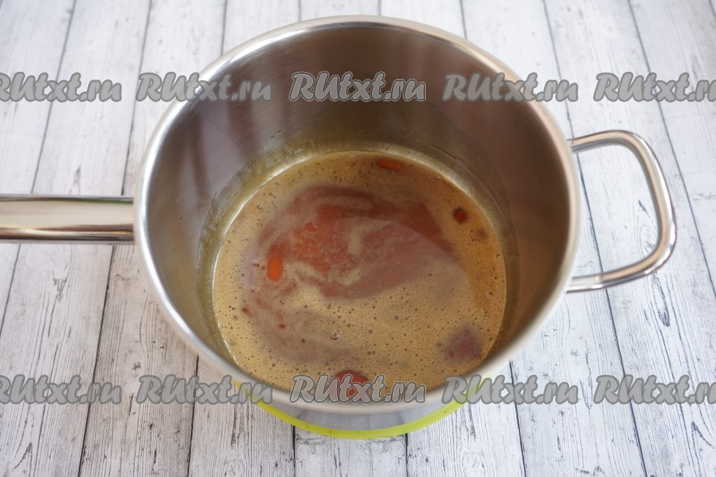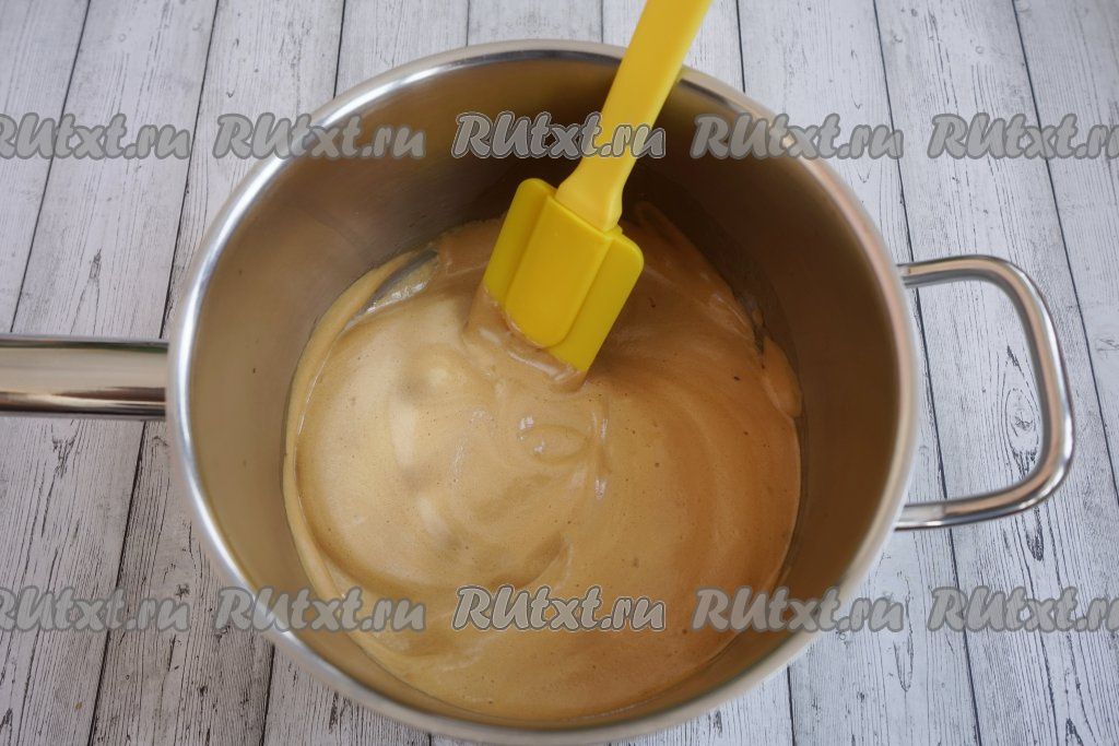 Наша цель - максимально растворить сахар. Сахарно-медовая масса вновь начинает пениться и становится объёмной. Увариваем массу, помешивая, 3-4 минуты. Если мёд изначально был жидким, возможно, придётся потратить на варку и 5 минут. Получается своего рода густая сахарно-медовая карамель.