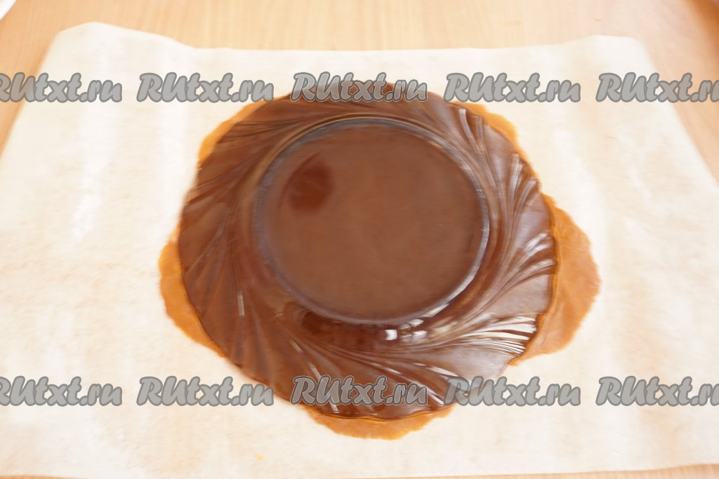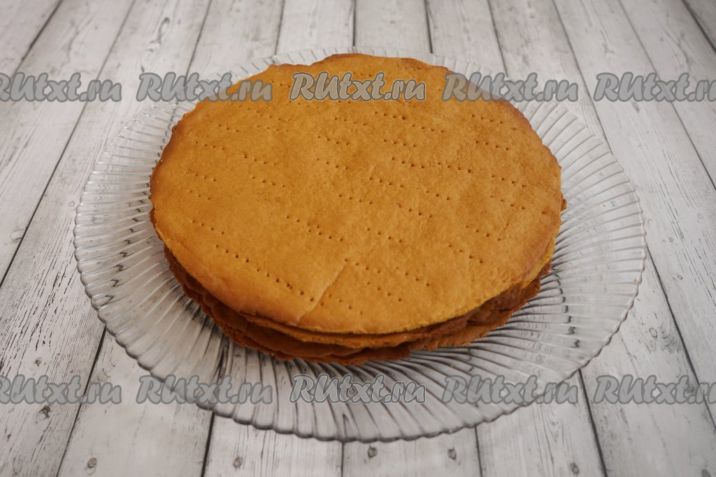 Выпекаем корж в духовке, разогретой до 180 градусов, 2-3 минуты. Будьте внимательны, коржи очень быстро подгорают! Готовый корж, достав из духовки, остужаем на ровной поверхности, затем снимаем бумагу для выпечки. Постепенно выпекаем все коржи для торта из оставшихся частей теста. Остывшие коржи складываем стопкой. Не забываем, что обрезки тоже нужно испечь и остудить.