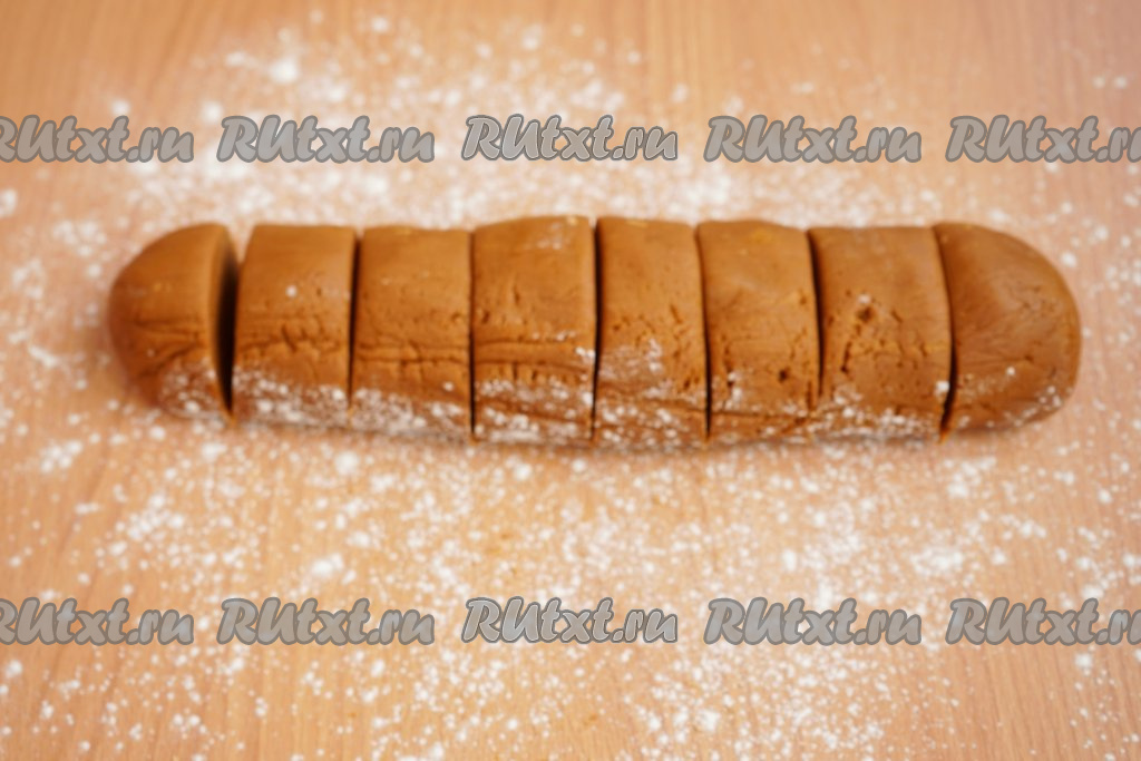 На поверхности, припылённой мукой, формируем из теста колбаску и делим её на 8 частей. Тут стоит оговориться. Я вырезала коржи для медового торта по тарелке диаметром 25 см и у меня получилось 7 коржей для торта и 1 корж пошёл на крошку для обсыпки. Если вы сделаете коржи диаметром 20 см, то из этого же количества продуктов получится 8-10 коржей (то есть торт будет меньшего диаметра, но выше). Если хотите и высокий, и большой по диаметру медовый торт, то стоит взять 1,5 нормы продуктов (или возможно даже 2). В общем, из кусочков теста формируем шарики. Кладём их на тарелку и отправляем в холодильник минут на 30. Не забудьте тарелку накрыть сверху пищевой плёнкой, чтобы тесто не заветрилось.