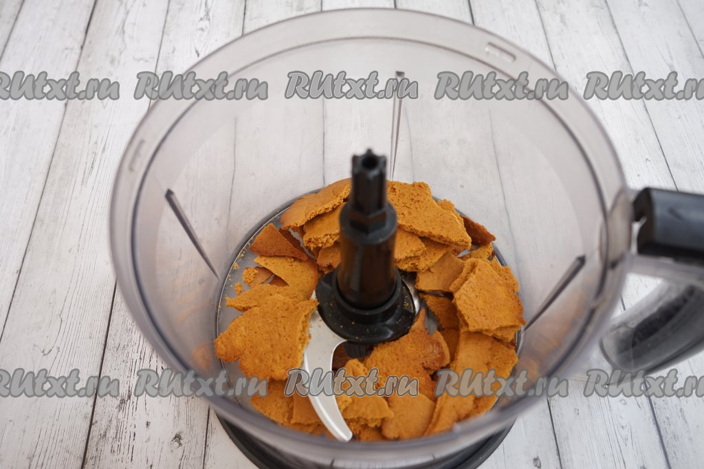 Отправляем в блендер обрезки коржей и оставшийся последний корж, тщательно перемалываем в крошку.