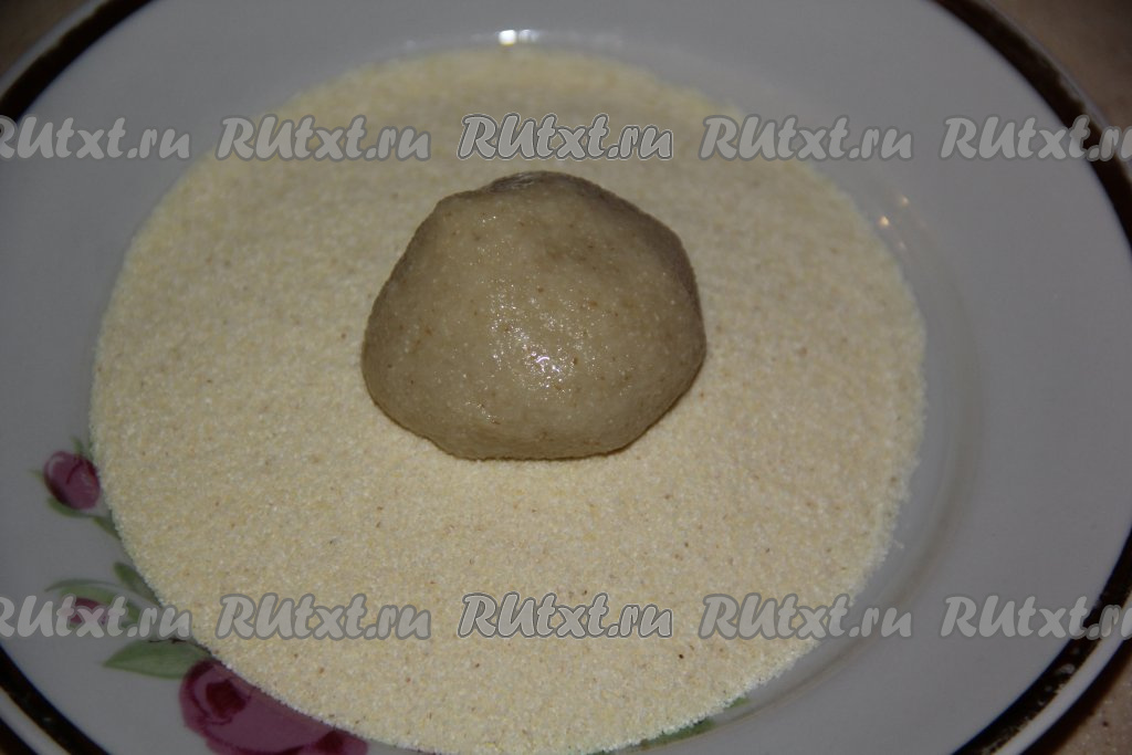 Влажными руками, отщипнув небольшое количество теста, сформировать шарик размером с грецкий орех. Обвалять шарик в манке со всех сторон. Аналогично сформировать все шарики, обваленные в манке, из оставшегося теста.