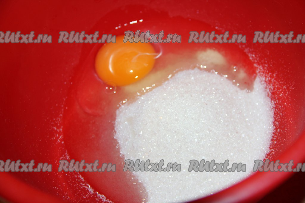 Соединить в достаточно объёмной миске яйцо, сахар и ванильный сахар.
