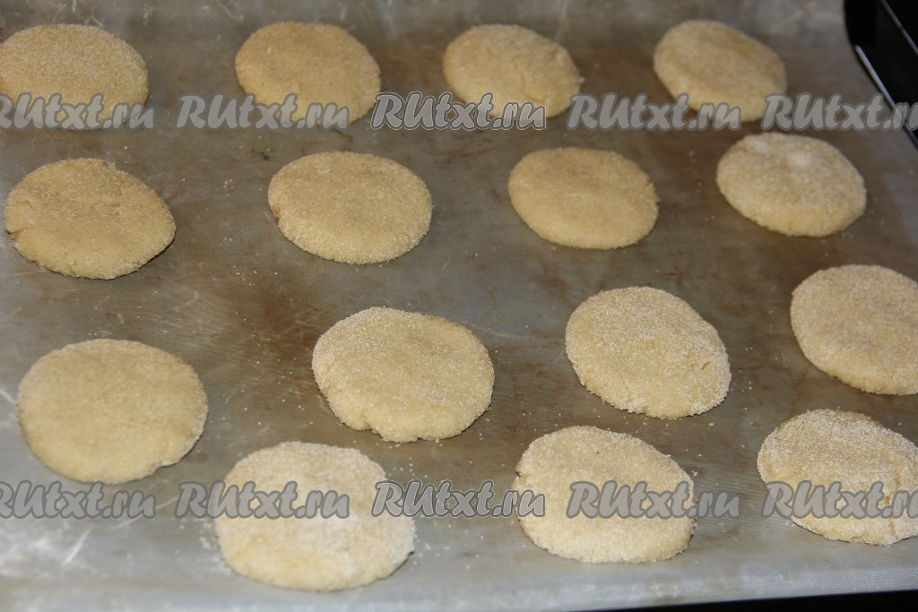 Противень застелить пергаментом (или тефлоновым ковриком) и выложить шарики, обваленные в манке, на расстоянии друг от друга. Слегка шарики приплюснуть.