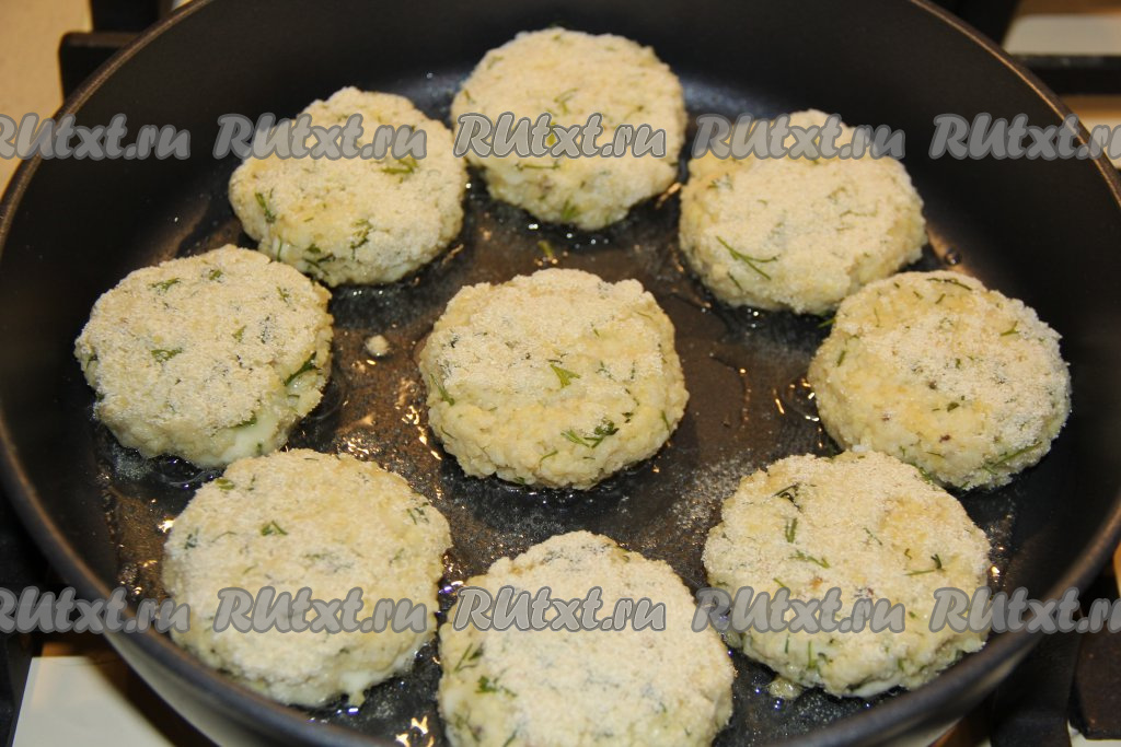 Сковороду разогреть с небольшим количеством растительного масла, выложить пшённые котлеты.