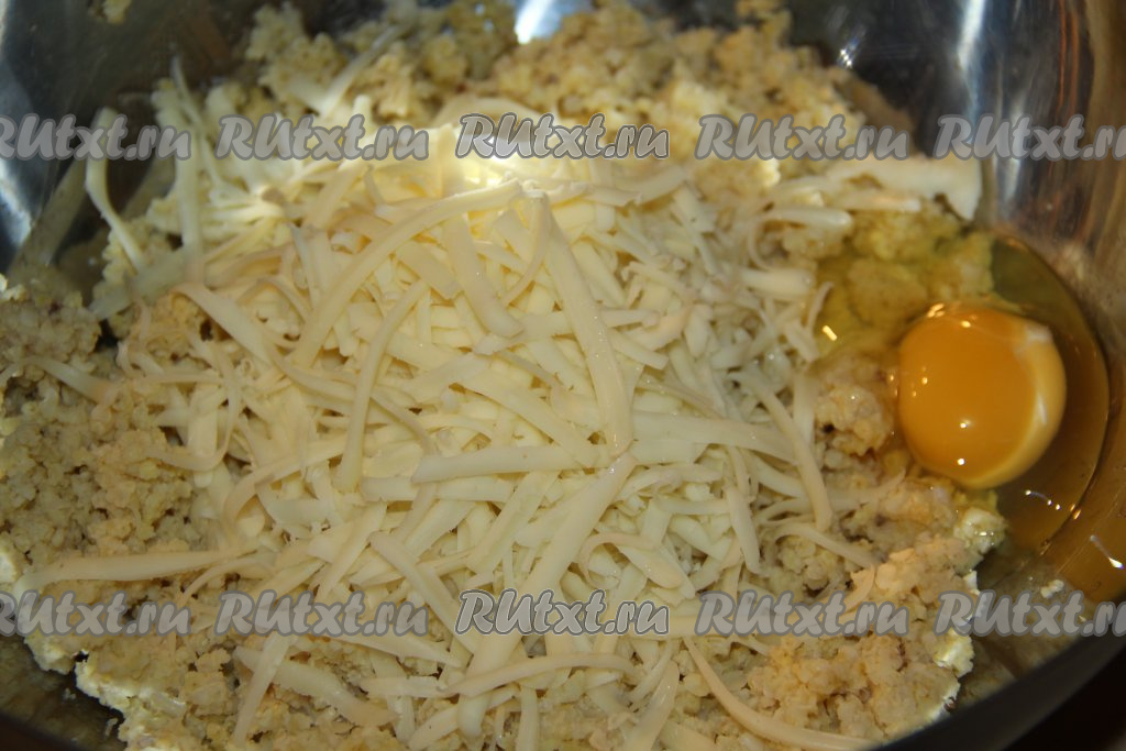 Тёплую пшённую кашу выложить в миску, добавить натёртый сыр и яйцо, тщательно перемешать.