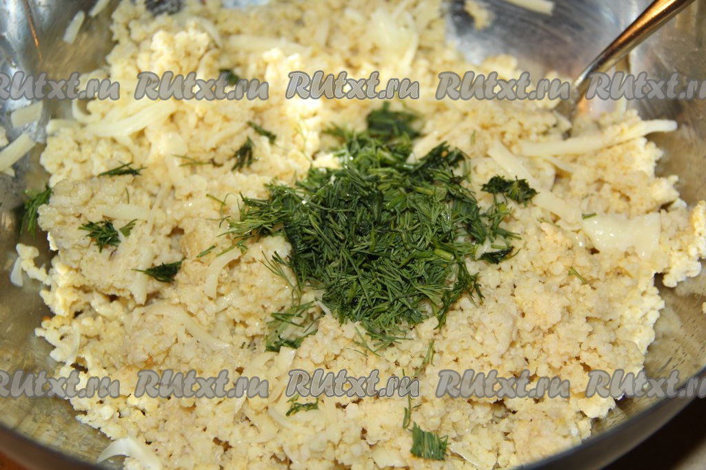 Вымыть укроп и немного обсушить, мелко нарезать, добавить в смесь пшена и сыра, подсолить по вкусу, перемешать.