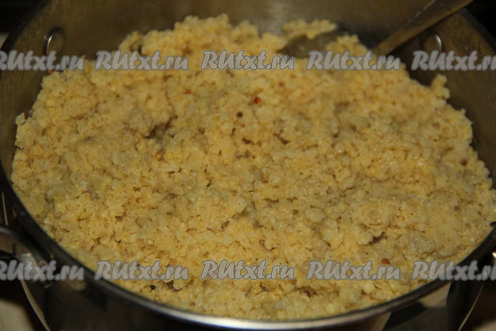 После закипания варить пшённую кашу до готовности и полного испарения жидкости на минимальном огне под крышкой (на это потребуется минут 20-25). Затем, сняв с огня, остудить, каша должна стать чуть тёплой.