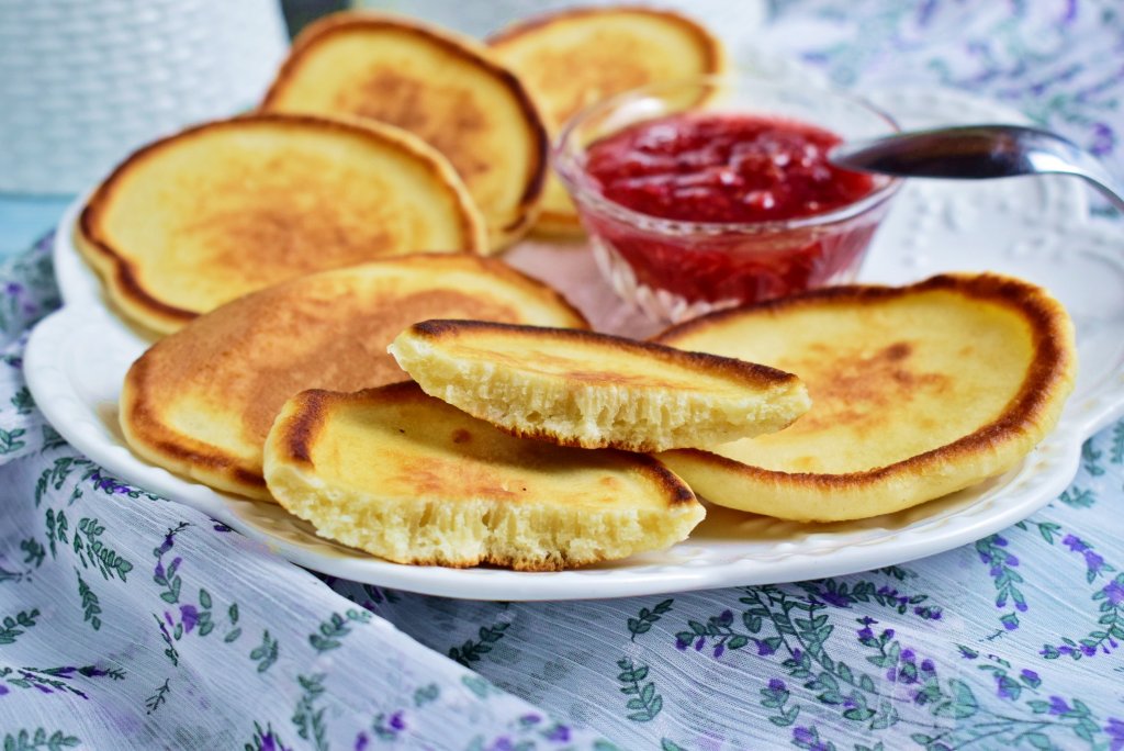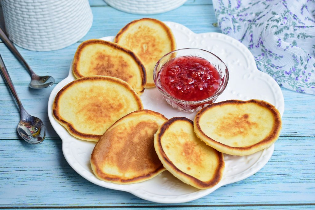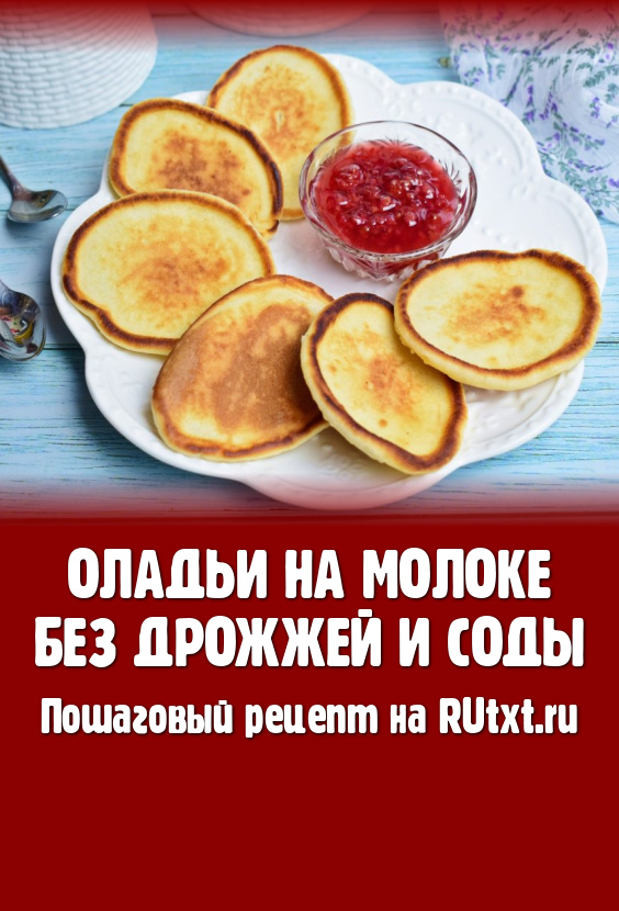 Аппетитные, вкусные, румяные оладьи, приготовленные на молоке без добавления дрожжей и соды, подавайте к столу горячими, дополнив джемом, сметаной или сгущёнкой.
