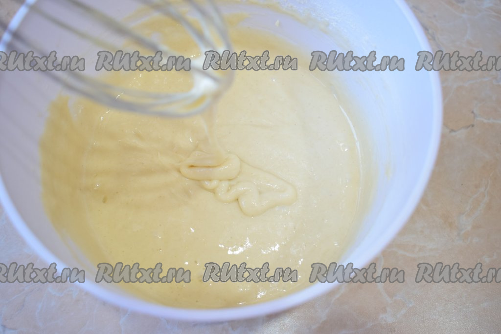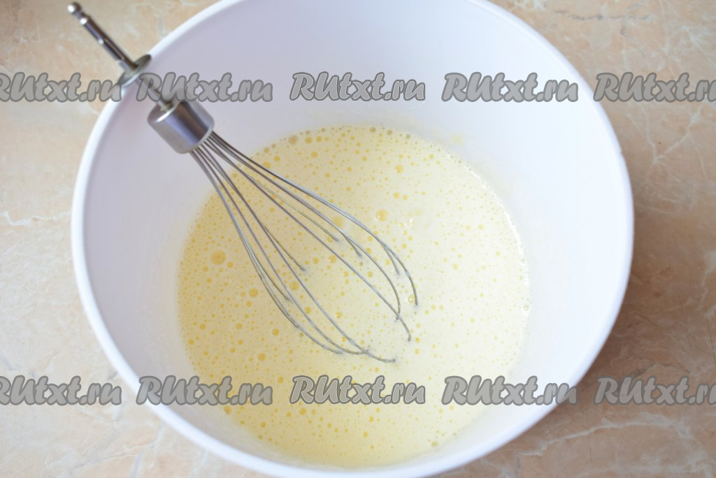 Миксером взбейте содержимое чаши в пышную пену (именно от этой пышности и будет зависеть пористость готовых оладий).
