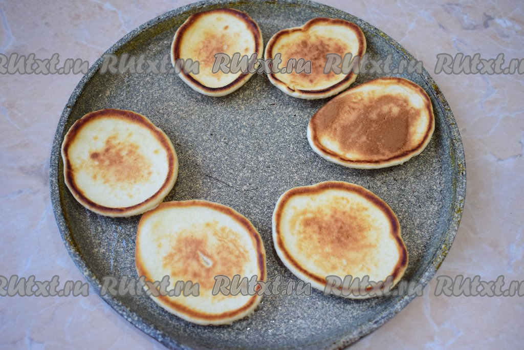 Оладьи жарьте до румяности с двух сторон (приблизительно, по 1-2 минуте с каждой стороны), затем перекладывайте на тарелку. Постепенно пожарьте все оладушки из оставшегося теста.