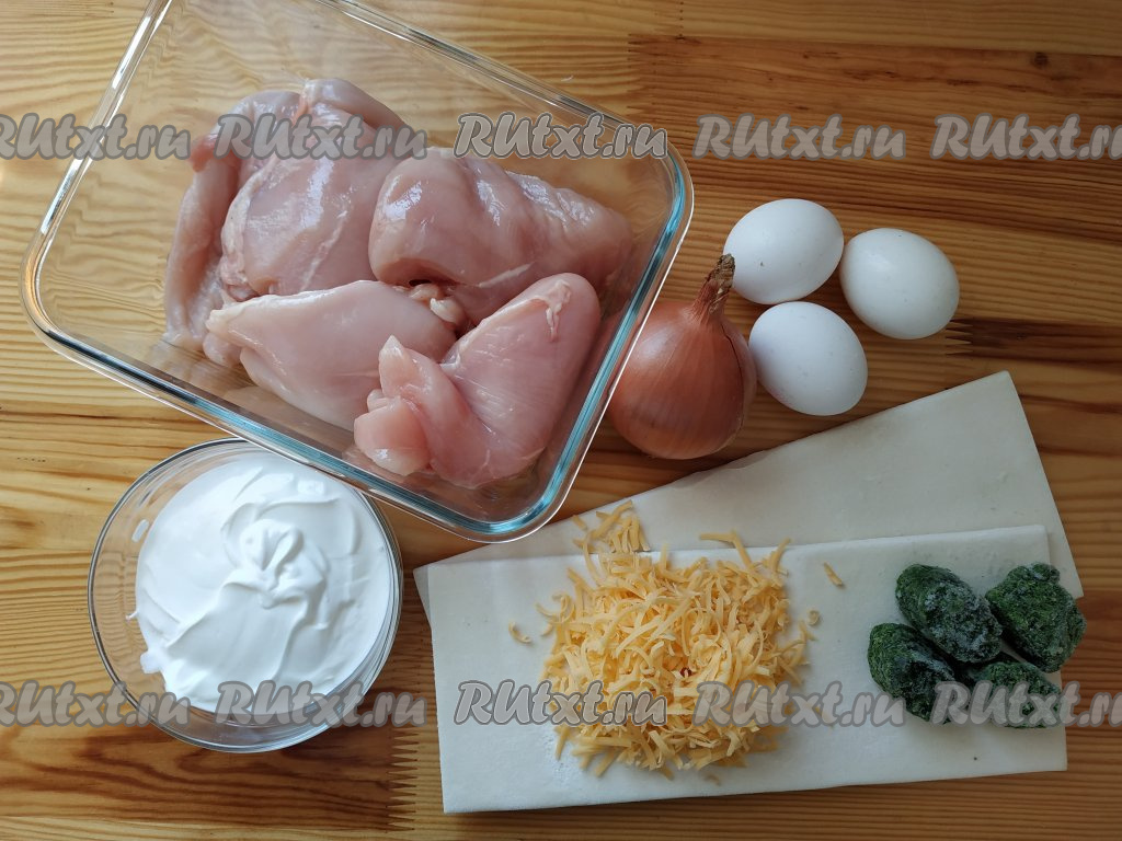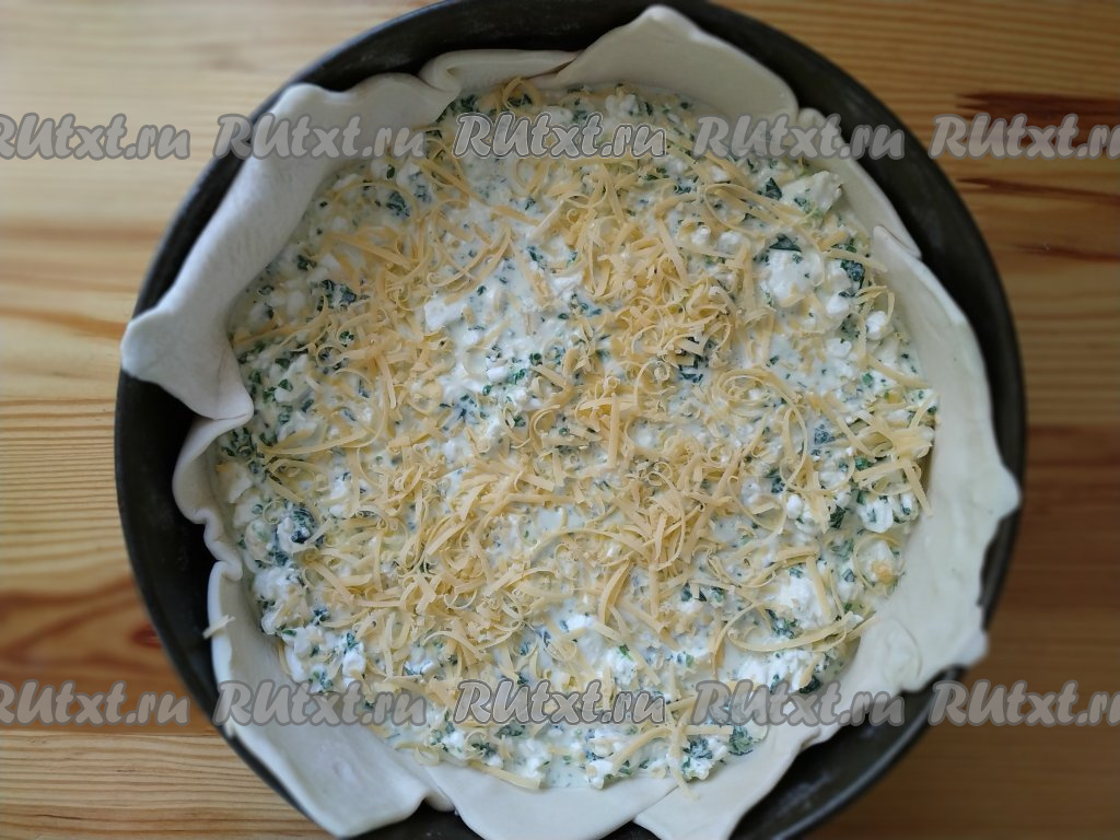 Сверху на тесто выкладываем подготовленную начинку из курицы и шпината, сверху равномерно посыпаем половиной натёртого сыра. Затем равномерно заливаем сметанно-яичной заливкой и присыпаем оставшимся сыром. При желании, украшаем кунжутными семечками.