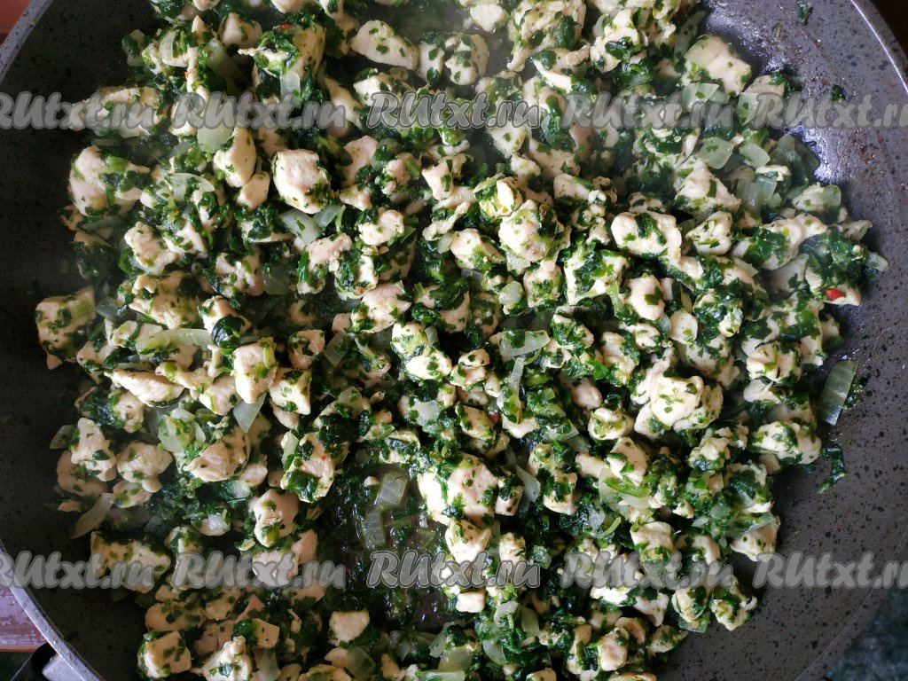 На сковороде на небольшом количестве растительного масла (я готовила на антипригарной сковороде, поэтому масло не добавляла) сначала обжариваем куриное филе, помешивая, на среднем огне до изменения цвета (это займёт, примерно, 5 минут). Затем добавляем лук, обжариваем ещё 3-5 минут, не забывая помешивать время от времени. Выкладываем шпинат, солим, добавляем специи по вкусу, тщательно перемешиваем. Если шпинат свежий, тогда просто перемешайте его с курицей и снимите сковороду с огня. Если используете, как и я, замороженный шпинат, то держите сковороду на огне, пока шпинат не разморозится. Сняв с огня, даём начинке из курицы и шпината немного остыть.