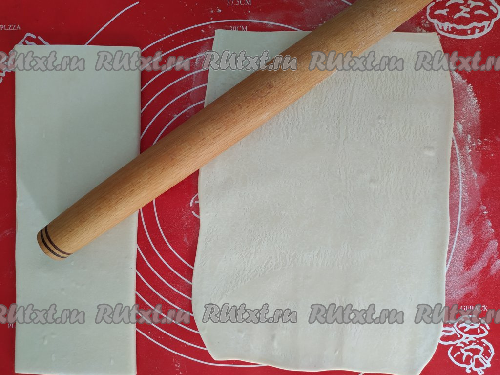 Слоёное тесто раскатываем на присыпанной мукой поверхности и выкладываем в форму для выпечки (я готовила в форме диаметром 28 см). Форму предварительно ничем не смазываем.
