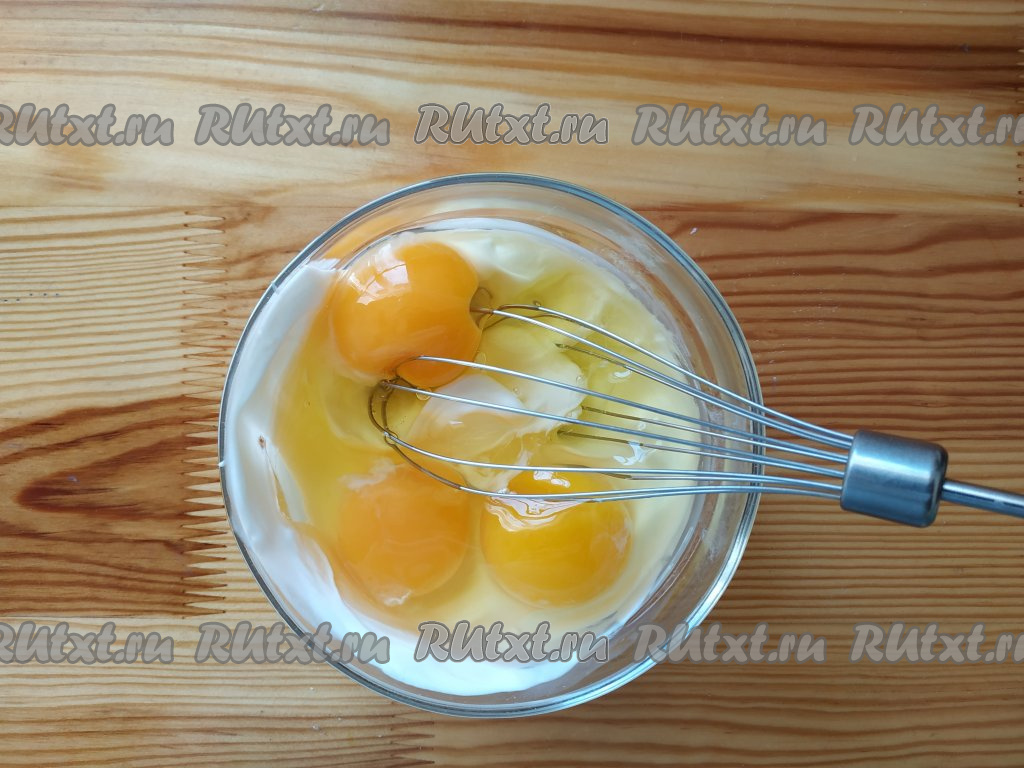 В отдельной ёмкости сметану смешиваем с яйцами с помощью венчика до однородной консистенции.
