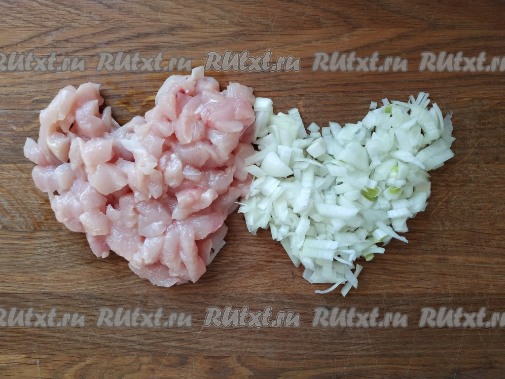 Вымытое и обсушенное куриное филе нарезаем на маленькие кусочки. Лук чистим и мелко нарезаем.