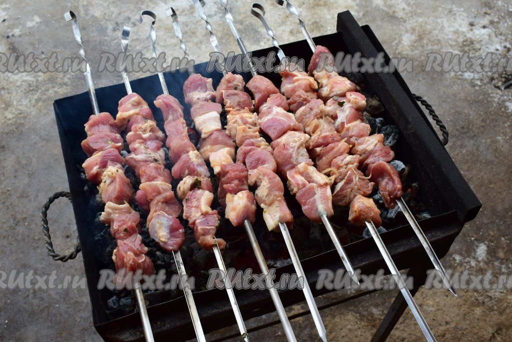 Замаринованное мясо для шашлыка нанизывайте на шампуры. Шашлык жарить следует на седых углях, без прямого огня. Жар должен быть хорошим. Шашлык готовим, периодически переворачивая шампуры, стараясь равномерно прожарить мясо со всех сторон. Готовность лучше всего определять, надрезав ножом кусочек мяса и посмотрев на надрез - он должен быть без розовых вкраплений.