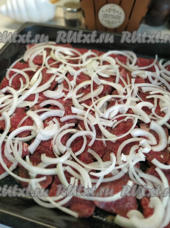 Лук очищаем, нарезаем достаточно тонкими полукольцами и равномерно распределяем поверх говядины.