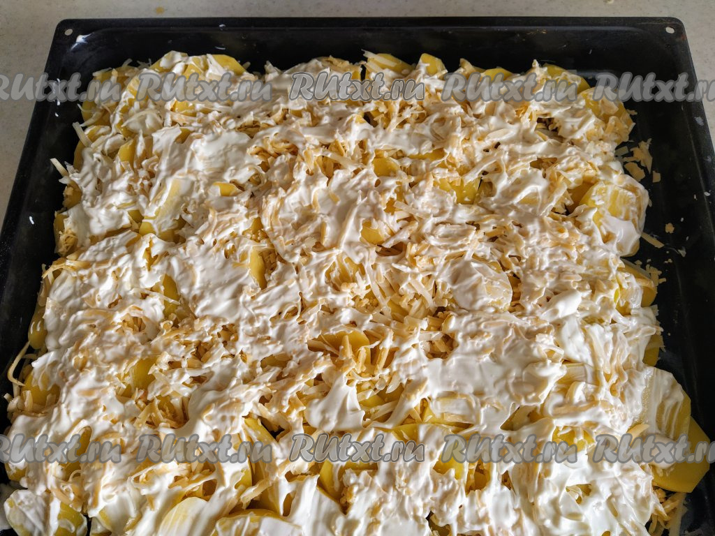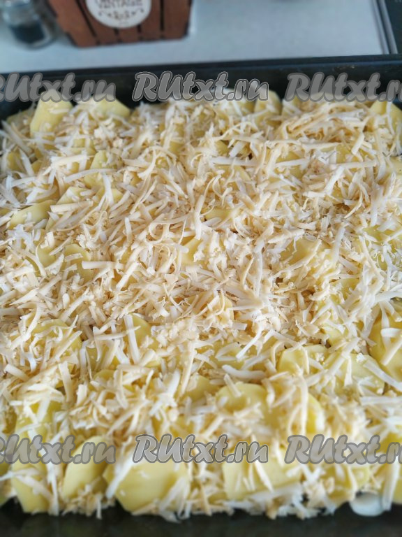 Сыр натираем на крупной тёрке и посыпаем им картофель.