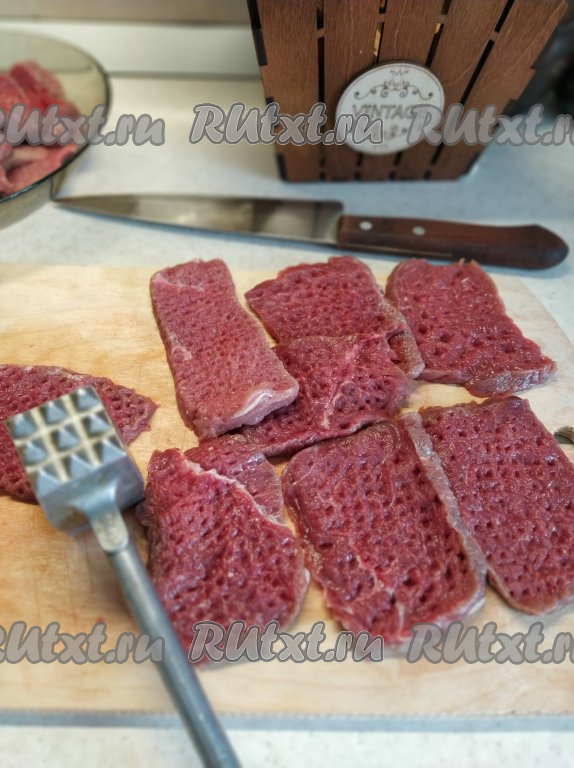 Блюдо запекается в духовке, поэтому все ингредиенты поочередно выкладываем на противень. Для начала подготовим говядину. Нарезаем мясо на достаточно большие ломтики толщиной около 1 см (куски мяса не должны быть толще 1 см, иначе говядина в процессе запекания с картошкой полностью не приготовится) и отбиваем с двух сторон кухонным молоточком.