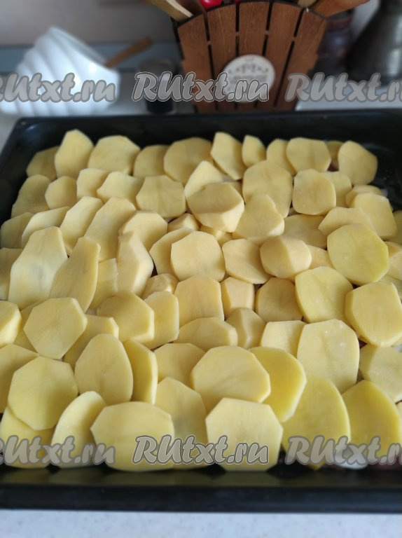 Далее подготовим картофель. Очищаем его и нарезаем плоскими кружочками толщиной 0,5 см, солим по вкусу (добавляя соль, обратите внимание на то, что в дальнейшем будут добавляться сыр и майонез, в состав которых тоже входит соль), выкладываем ровным слоем на кусочки говядины с луком.