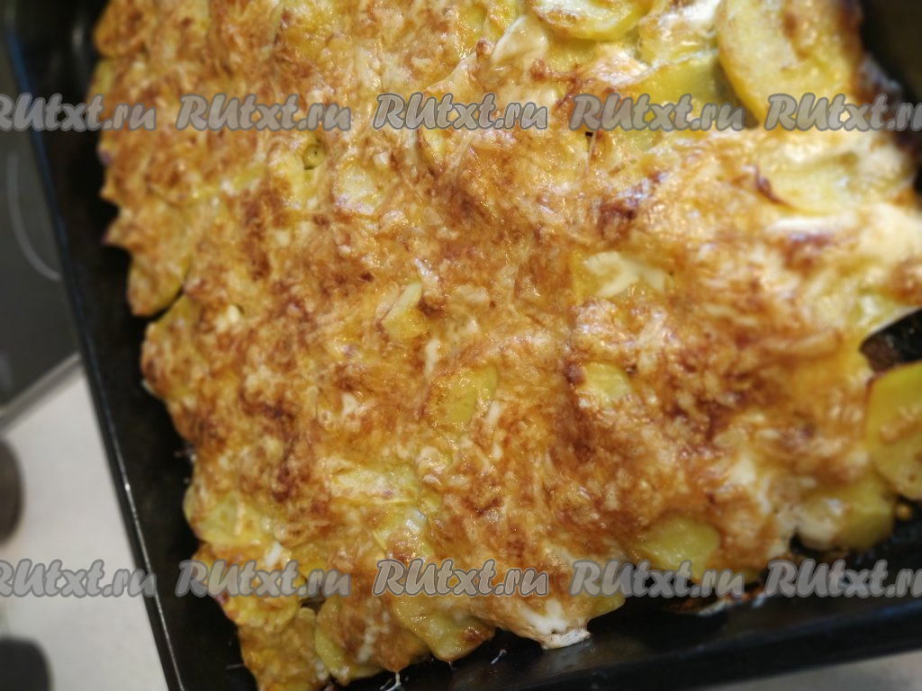 Разогреваем духовку до 200 градусов и отправляем запекаться блюдо на 50 минут в разогретую духовку. По прошествии времени проверяем блюдо на готовность (достаточно проткнуть мясо и картофель ножом, если нож входит без усилий, значит наше блюдо готово). Если по истечении времени сыр начал немного подгорать, а блюдо ещё не готово, можно накрыть противень фольгой и довести мясо с картофелем в духовке до готовности.