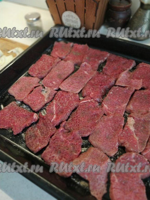 Выкладываем мясо на противень в один слой, солим и перчим по вкусу.