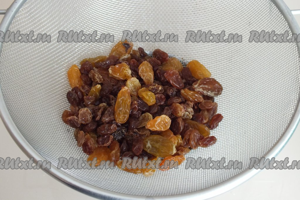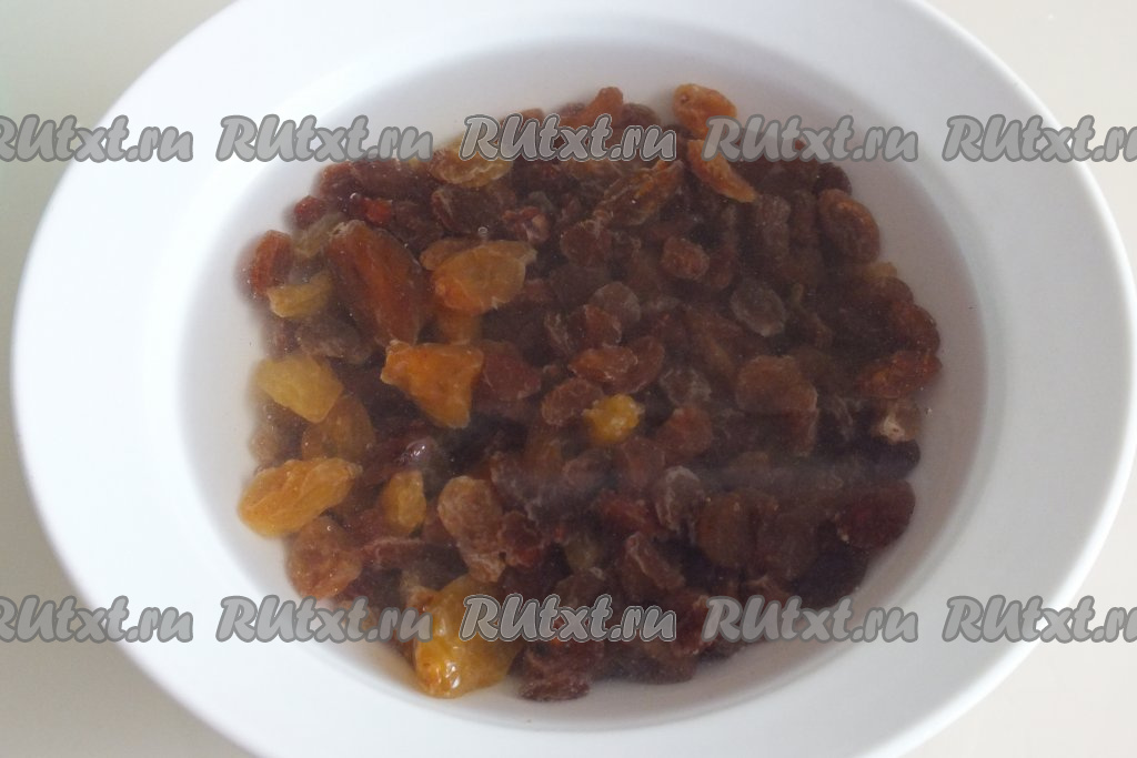 Приготовление печенья начните с подготовки изюма. Промойте его, полностью залейте кипятком так, чтобы он полностью покрыл сухофрукты. Оставьте на 5 минут.