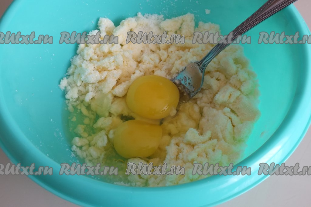 К масляно-сахарной массе добавьте 2 яйца, тщательно перемешайте вилкой.