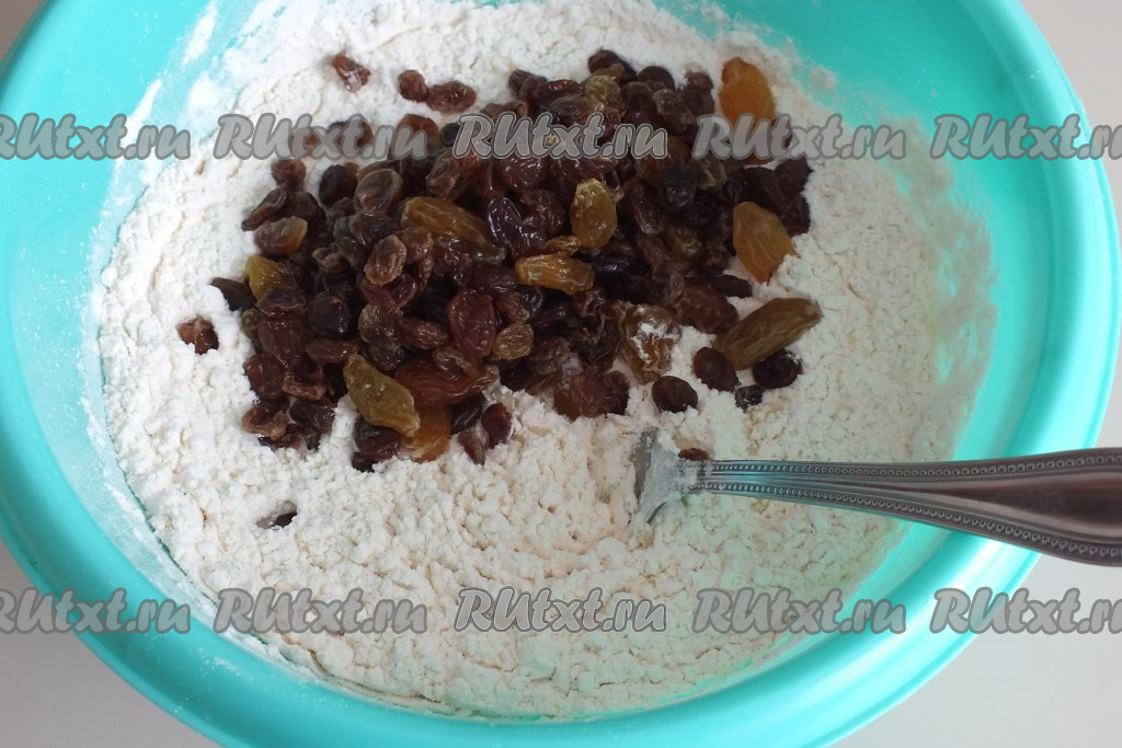 Начните перемешивать тесто вилкой. Затем добавьте обсохший изюм и замесите тесто руками.