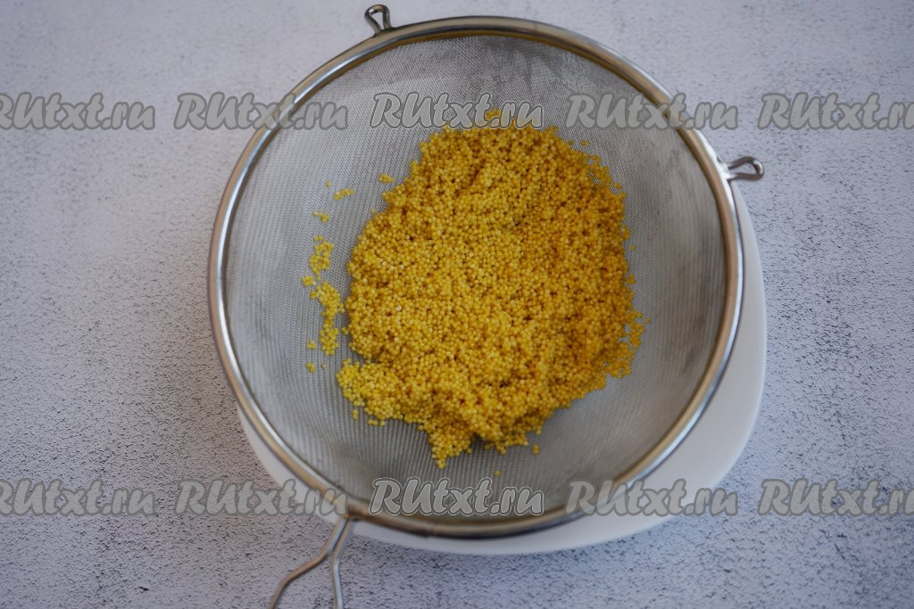 Для того чтобы приготовить вкусную пшённую кашу с яблоком, нужно для начала перебрать и промыть пшено. Крупу тщательно промываем под проточной водой и отбрасываем на мелкое сито.
