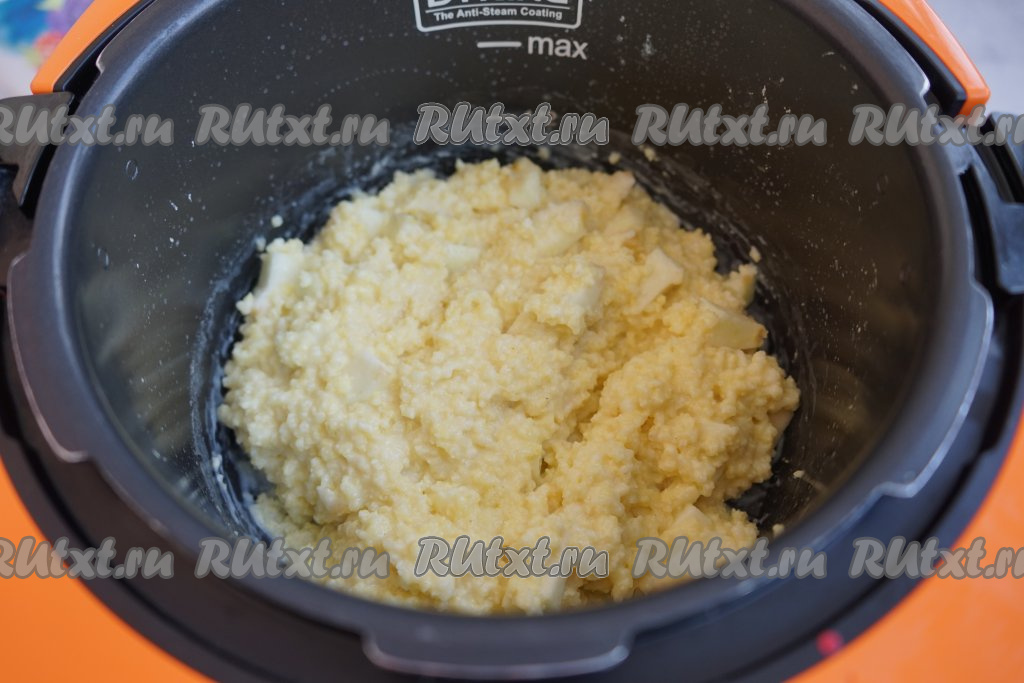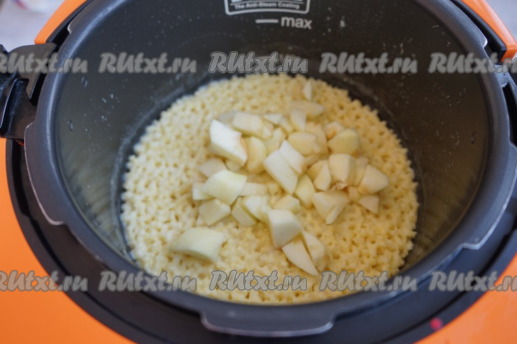 За 5 минут до полной готовности пшённой каши, открываем крышку и добавляем нарезанное яблоко, перемешиваем, вновь закрываем крышку и готовим до сигнала.