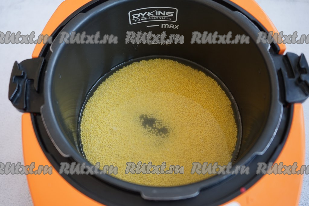 Перекладываем промытое пшено в чашу мультиварки и наливаем 400 мл воды.