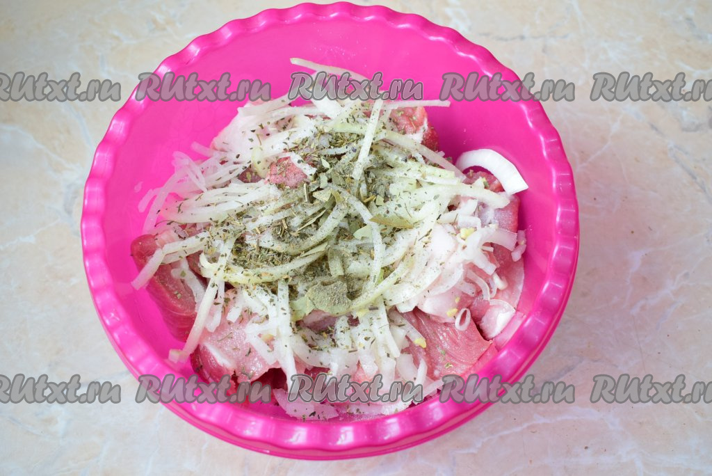 Добавьте к мясу измельчённый лавровый лист. По вкусу посолите мясо и добавьте любимые специи (это могут быть ароматные травы или просто молотый чёрный перец). Все ингредиенты хорошо перемешайте, накройте чашу крышкой (или пищевой плёнкой) и оставьте мариноваться шашлык при комнатной температуре на 2-6 часов (если вы планируете мариновать мясо более длительное время, тогда уберите чашу в холодильник).